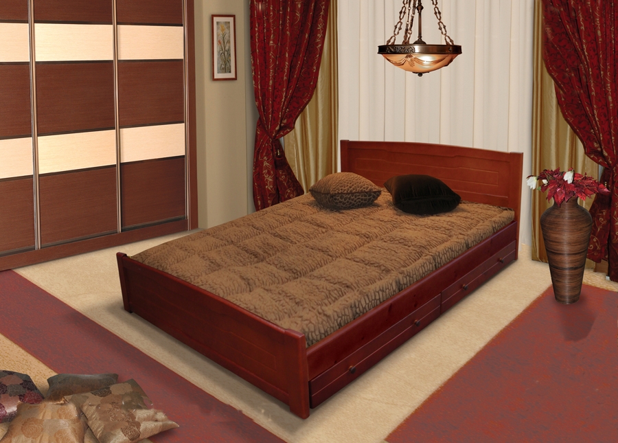 Деревянная кровать "Мери с ящиками" купить недорого в МосквеИспользуемый материал: массив сосны, шлифованная мебельная фанера, ДВП. В стандартной комплектации основание под матрац - лаги.