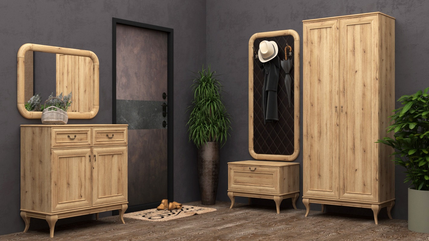 В серию входят шкафы различной ширины с бельевым и платяным отделениями, тумбы, комоды и банкетки. Оригинальным штрихом серии стал настенный щит с прострочкой в виде ромбов. Темная обивка цвета «антик коричневый» выигрышно подчеркивает оттенок «золотистого дуба», выбранный для оформления мебельных фасадов.