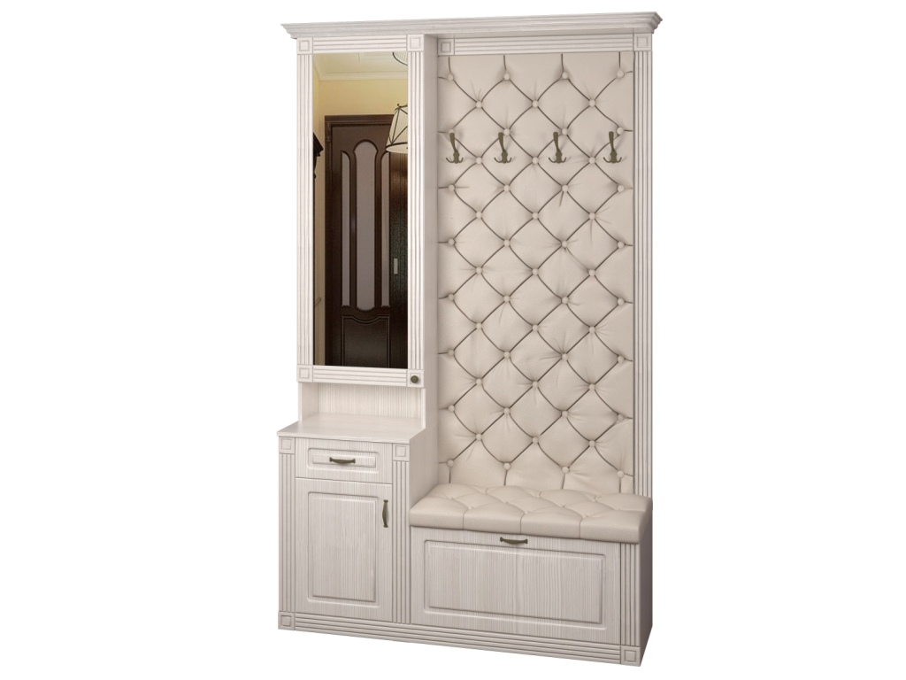 Используемый материал: корпус - ламинированное ДСП 16 мм; зеркало; фасады, карниз и пилястры - МДФ; ЛДВП. Мягкая панель декорирована каретной стяжкой. Доступен выбор вариантов ткани для обивки: это может быть велюр, рогожка или экокожа различных цветов.
