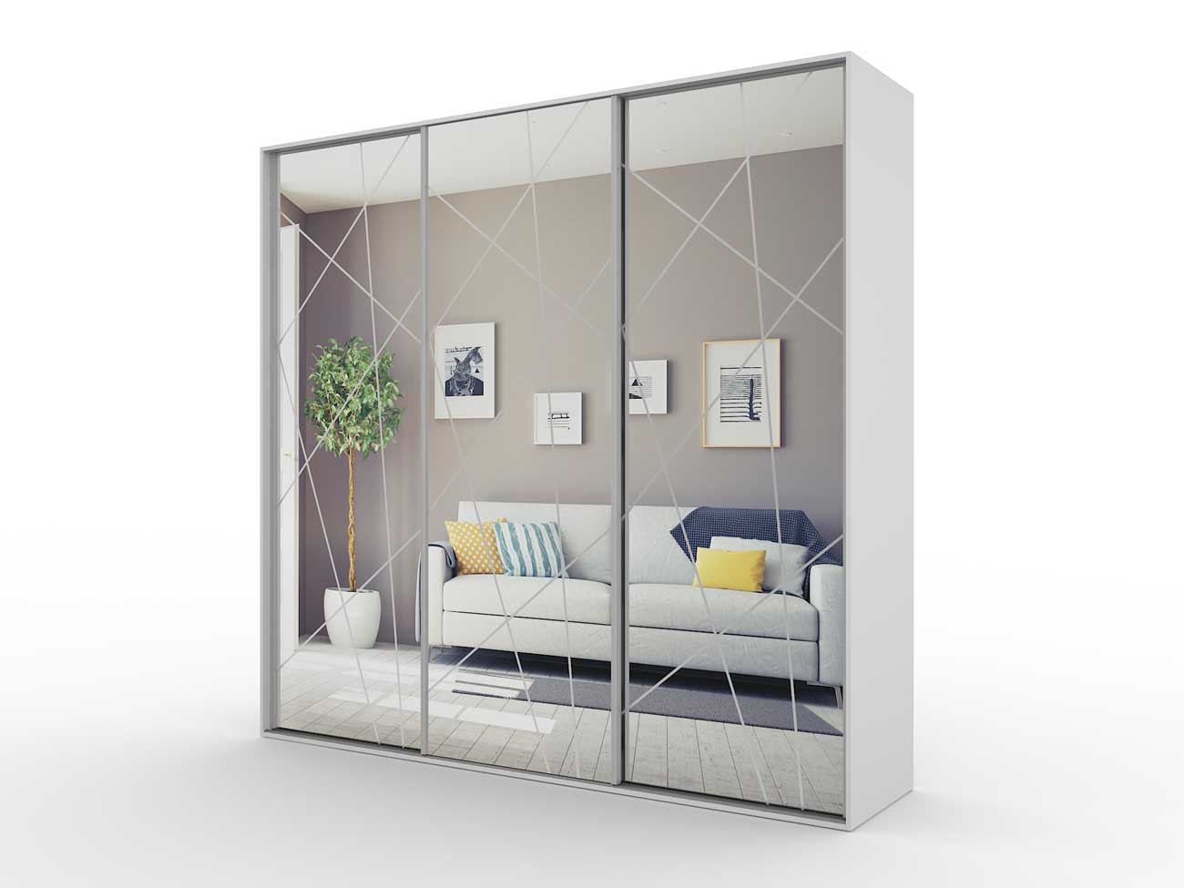 В базовую комплектацию шкафа входит кромка 0.4 мм, ручки торцевые, ламинированное ДСП 16 мм, ламинированное ДВП, направляющие Версаль, ходовые ролики РКМ-70, зеркала с пескоструйным рисунком
