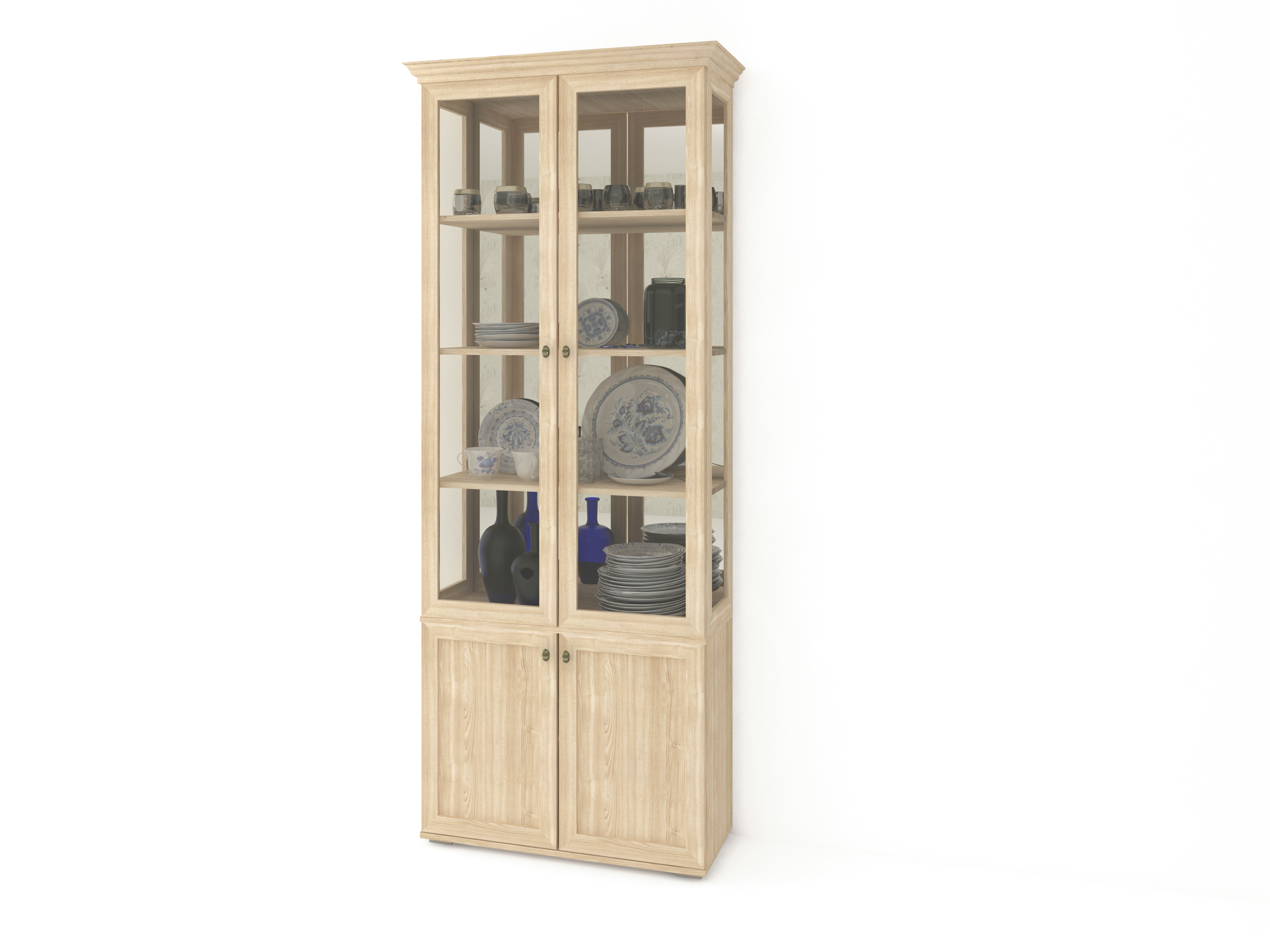 Стандартная комплектация: ламинированный ДСП, МДФ рамка, стекло, ламинированное ДВП, кромка 0,4 мм. Фурнитура стандартная: петли без доводчика. Ручки бронза по фото. На задней стенке изделия установленнны ЗЕРКАЛА. Полки ЛДСП. Высота изделия указана с учётом карниза.