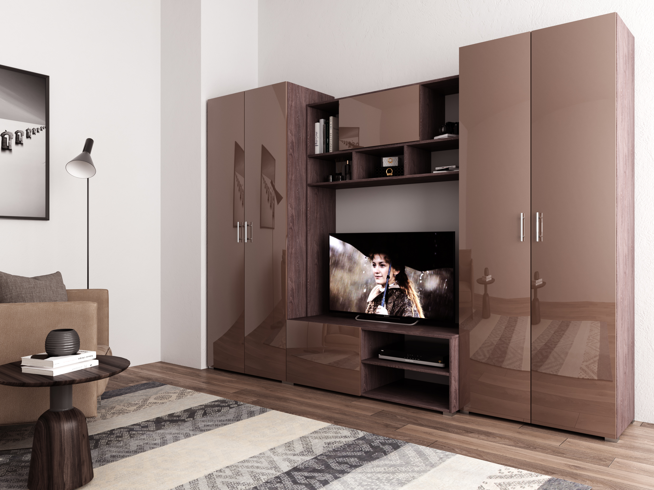 Шкаф 2-х дверный распашной левый - полка под головные уборы + штанга. Тумба под ТВ дверь открывается вниз на барном кронштейне, за дверью 1 полка. Антресоль дверь открывается вверх на газлифте. Шкаф 2-х дверный распашной правый - полки.