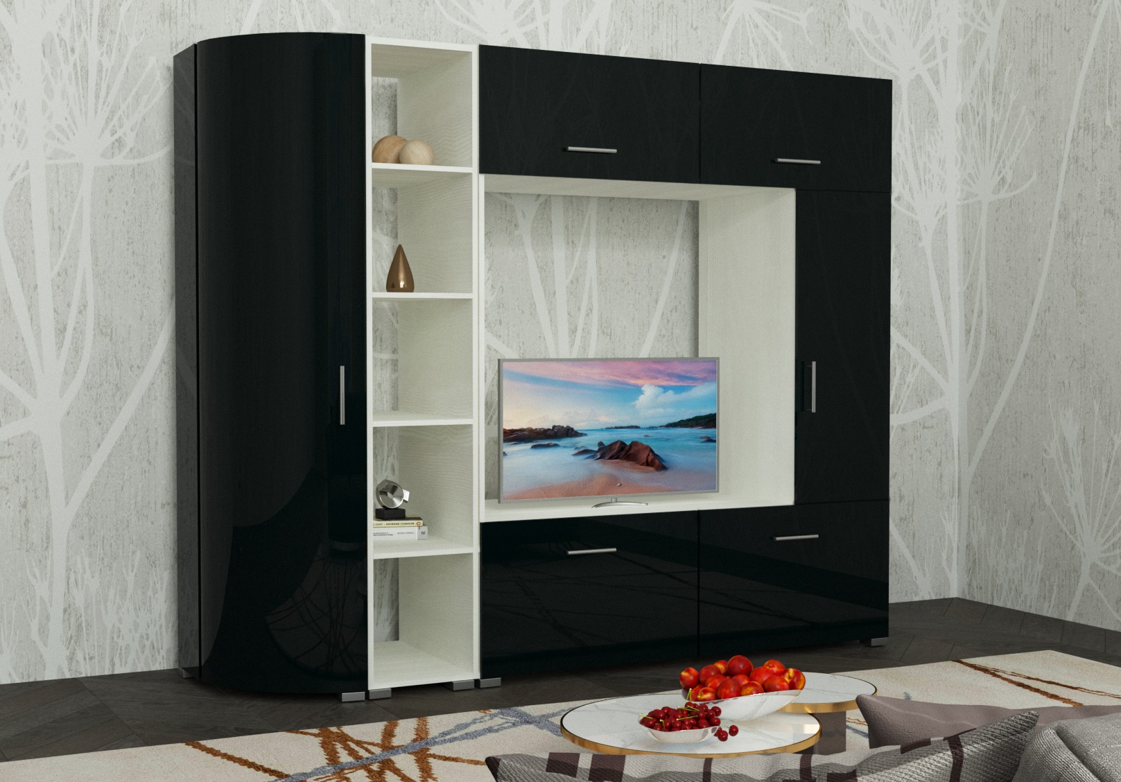 Колонка радиусная: 4 полки. Стеллаж открытый: 4 полки. Тумба ТВ: двери открываются вниз, за каждой дверью по 1 полке. Шкаф навесной: двери открываются вверх на газлифтах, за каждой дверью 1 отделение. Шкаф распашной: за дверью 2 полки.